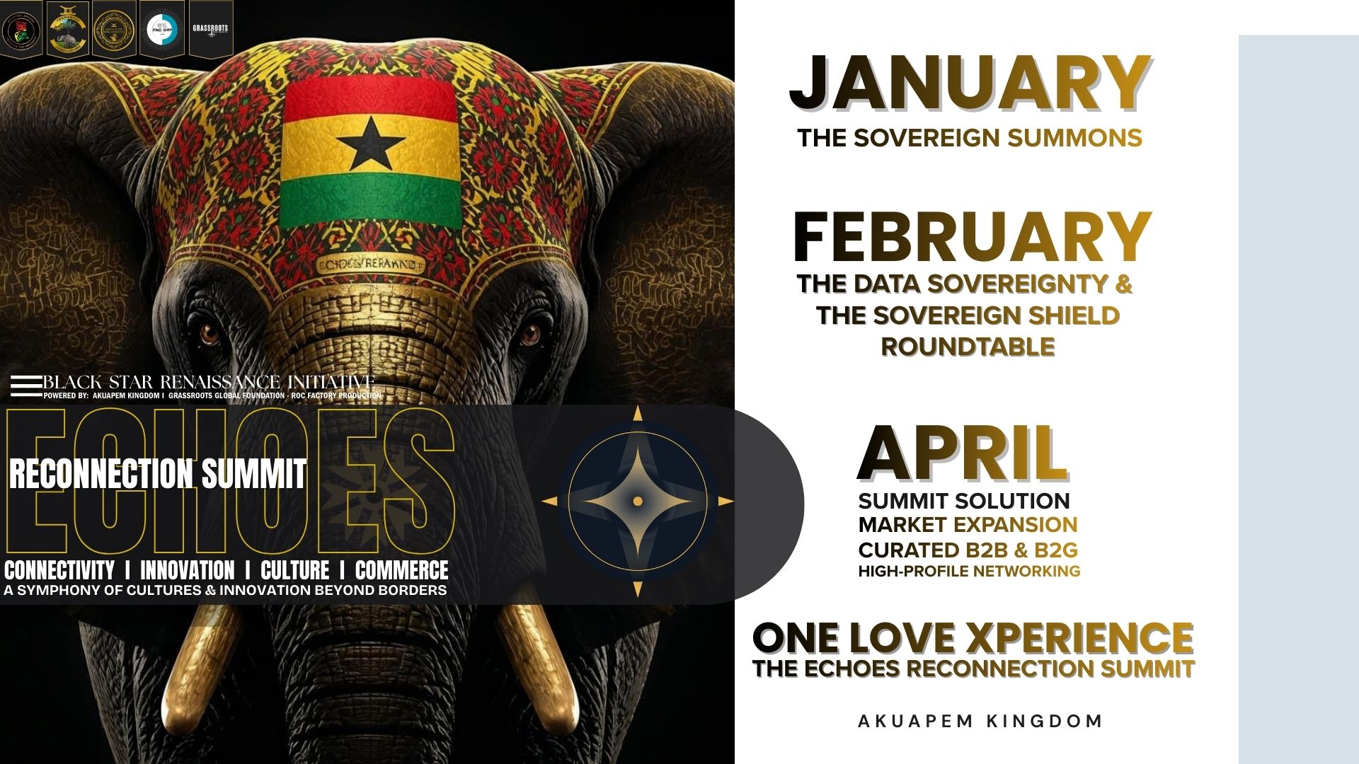 ECHOES is the definitive sovereign bridge and corridor established to align the economic and cultural authority of West Africa, the Caribbean, and the Global Diaspora. This is a high-profile, solution-driven ecosystem focused on strategic integration, tangible investment into the land trust, and the development of the Return City. Under the guidance of our Master of Ceremonies, His Majesty, The Okuapehene, Oseadeeyo Kwasi Akuffo III. Nations and partners are invited to establish their presence within our Thematic Pavilions. Providing a platform to exhibit your nation’s future through our four strategic pillars: Innovation I Culture I Commerce